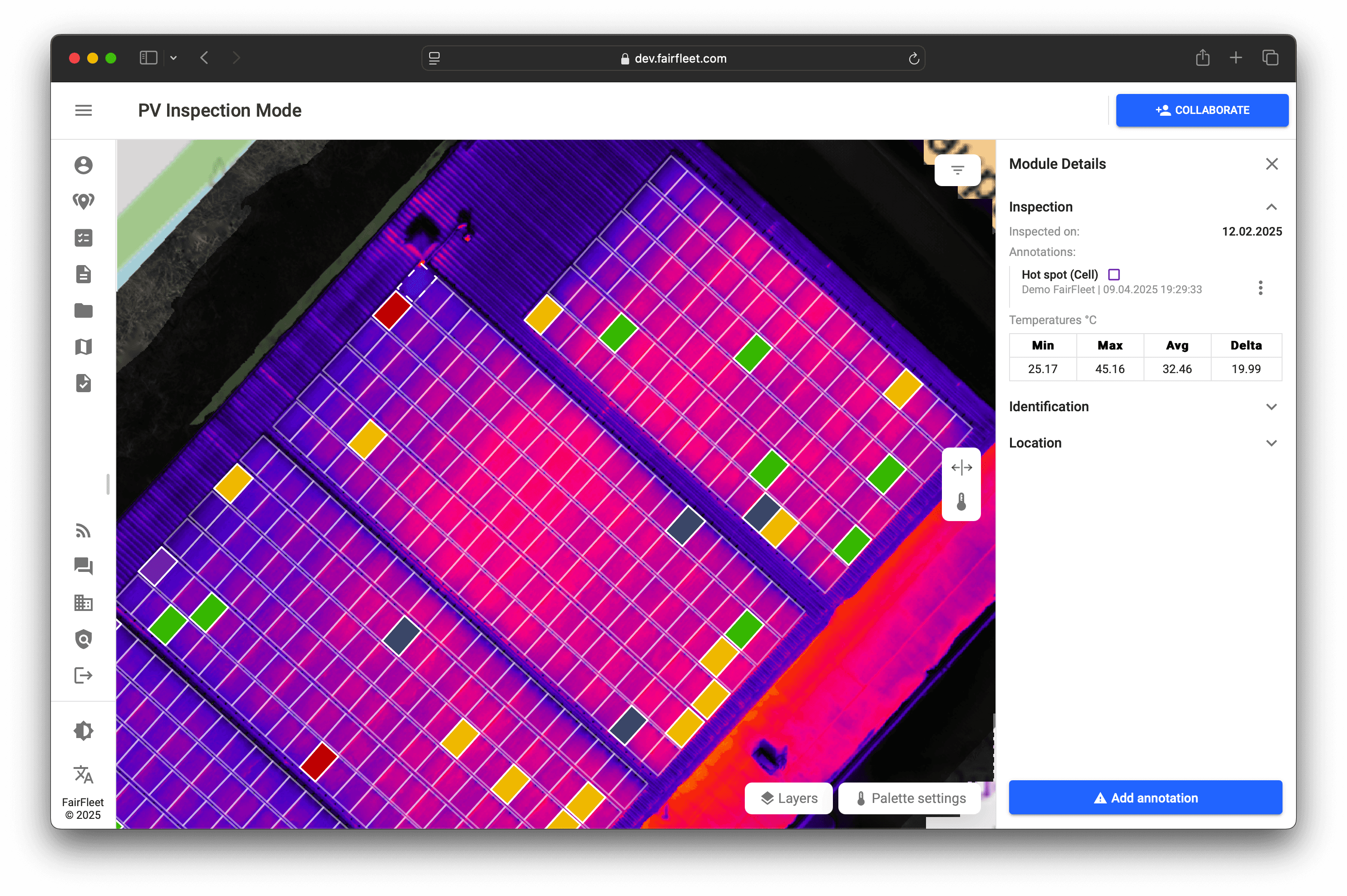 Thermography, imagery, and serial number scans are seamlessly combined, giving you a full performance and traceability overview at module level. Data is securely stored, instantly accessible, and exportable in GeoJSON or Excel for direct use in your asset management systems.
